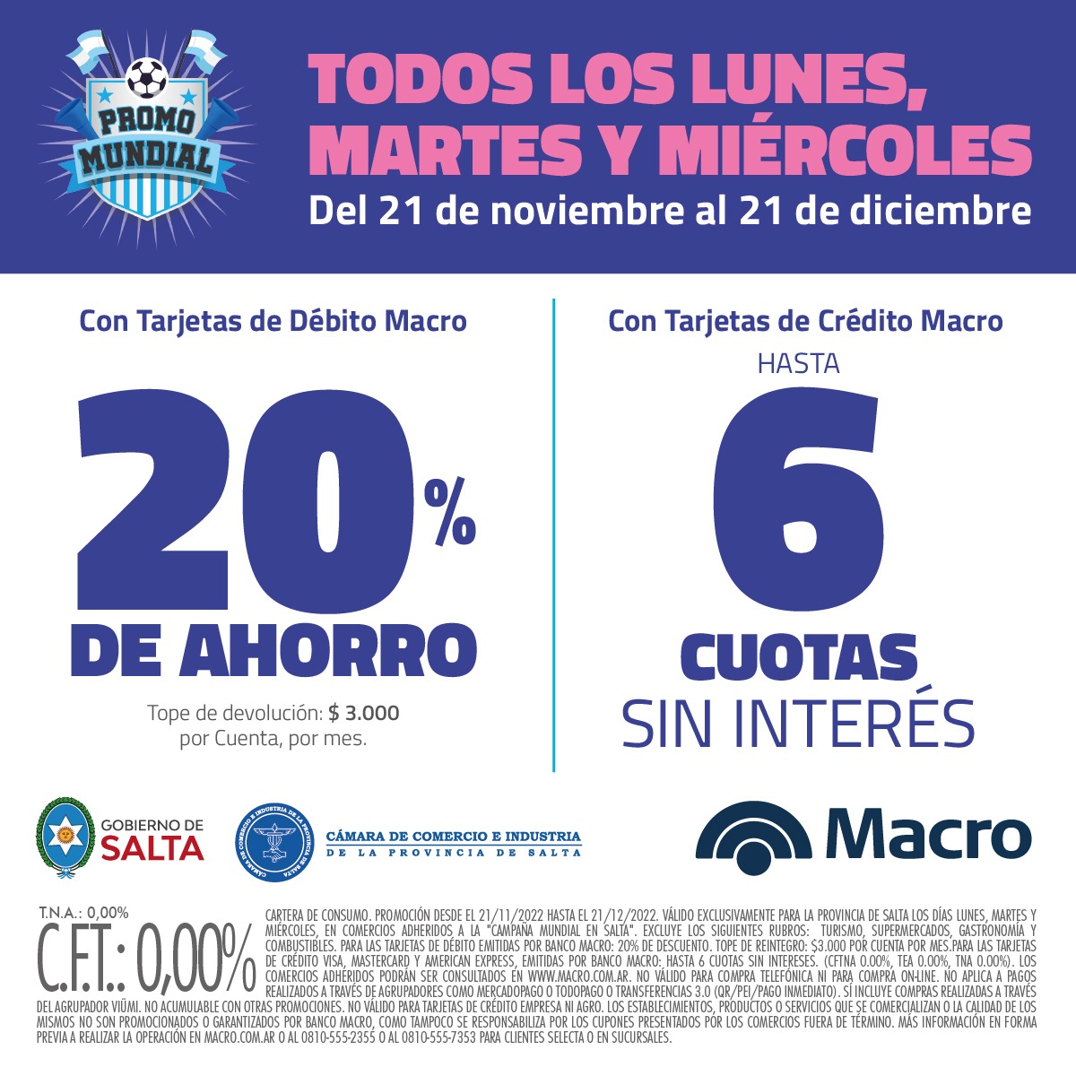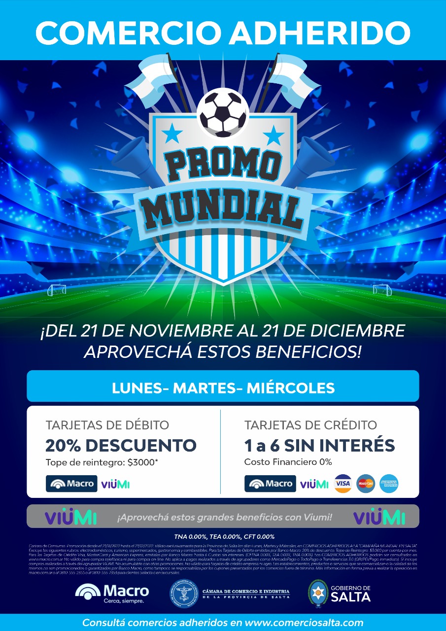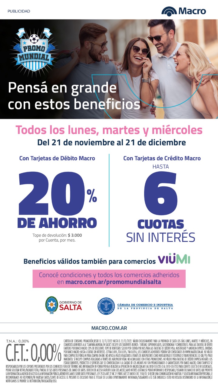 Cartera de Consumo. Promoción desde el 21/11/2022 hasta el 21/12/2022. Válido exclusivamente para la Provincia de Salta los días Lunes, Martes y Miércoles, en COMERCIOS ADHERIDOS A LA "PROMO MUNDIAL". Excluye los siguientes rubros: electrodomésticos, turismo, supermercados, gastronomía y combustibles. Para las Tarjetas de Débito emitidas por Banco Macro: 20% de descuento. Tope de Reintegro: $3.000 por cuenta por mes. Para las Tarjetas de Crédito Visa, MasterCard y American Express, emitidas por Banco Macro: hasta 6 Cuotas sin intereses. (CFTNA 0.00%, TEA 0.00%, TNA 0.00%). Los COMERCIOS ADHERIDOS podrán ser consultados en www.macro.com.ar No válido para compra telefónica ni para compra on-line. No aplica a pagos realizados a través de agrupadores como MercadoPago o TodoPago o Transferencias 3.0 (QR/PEI/Pago Inmediato). Sí incluye compras realizadas a través del agrupador VIÜMI. No acumulable con otras promociones. No válido para tarjetas de crédito empresa ni agro. Los establecimientos, productos o servicios que se comercializan o la calidad de los mismos no son promocionados o garantizados por Banco Macro, como tampoco se responsabiliza por los cupones presentados por los comercios fuera de término. Más información en forma previa a realizar la operación en macro.com.ar o al 0810-555-2355 o al 0810-555-7353 para clientes Selecta o en sucursales.